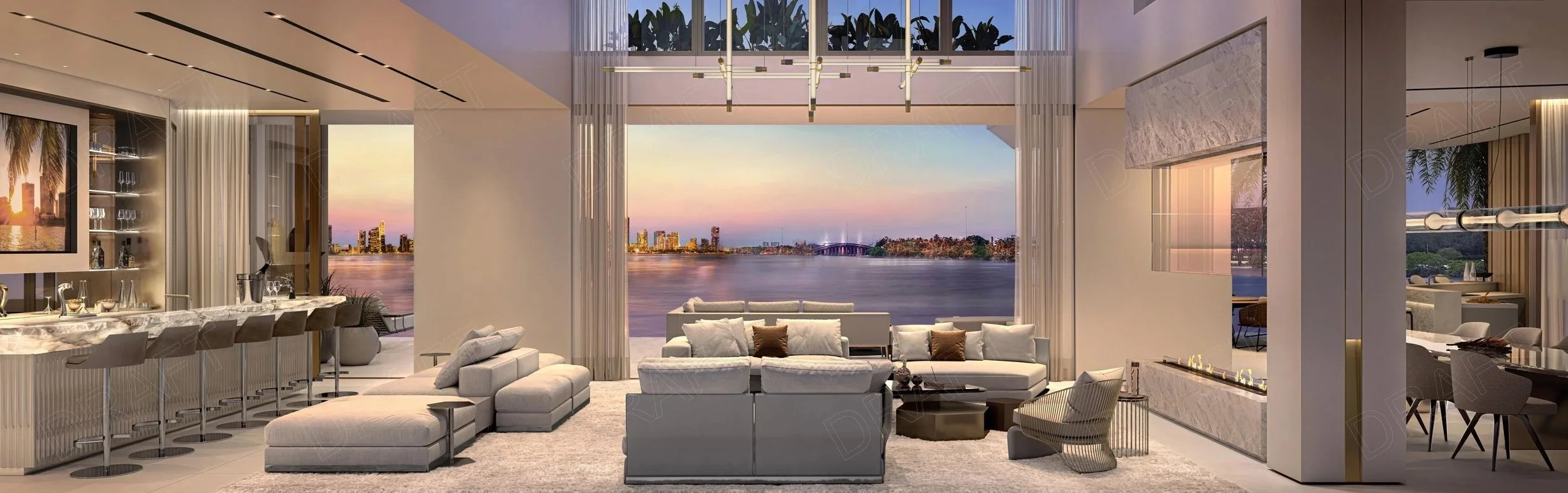 A grand stone entrance and a dramatic, water-driven arrival sequence set the tone, guiding visitors into a space that feels both intentional and refined. Panoramic views of the bay and the Miami skyline further elevate the experience, balancing luxury with everyday livability.